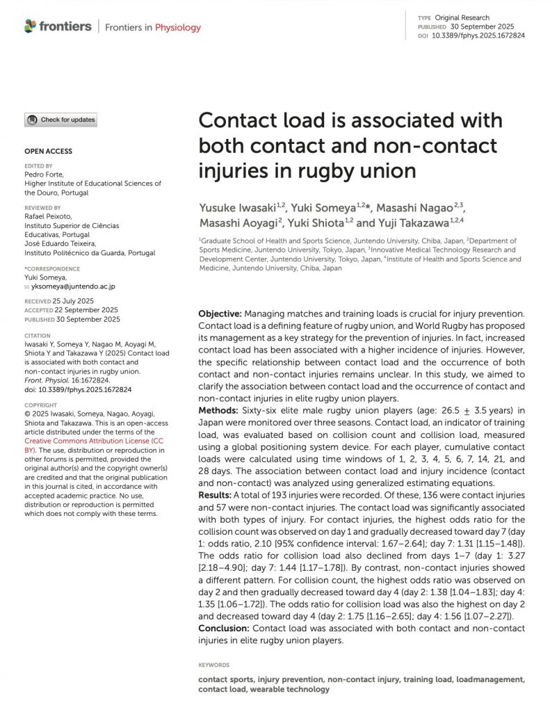 ラグビーはフルコンタクトスポーツであり、コンタクトプレーによる負荷(Contact Load)はラグビー選手の身体に大きな影響を与えます。本研究では、国内エリートラグビー選手を対象に3シーズンにわたるデータを分析した結果、Contact Loadが、接触型外傷のみならず、肉離れに代表される非接触型外傷・障害のリスクにも有意に関連していることが明らかになりました。本研究は、Contact Loadが非接触型の外傷・障害にも影響を与えることを明らかにした重要な報告であり、ラグビー選手の外傷・障害予防を考える上で重要な知見となることが期待されます。